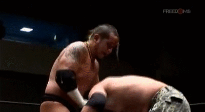 O estreante encerra sua sequência ao se afastar um pouco de Pillman e voltar em direção ao mesmo lhe aplicando um forte KING KONG LARIAAAAT!!!